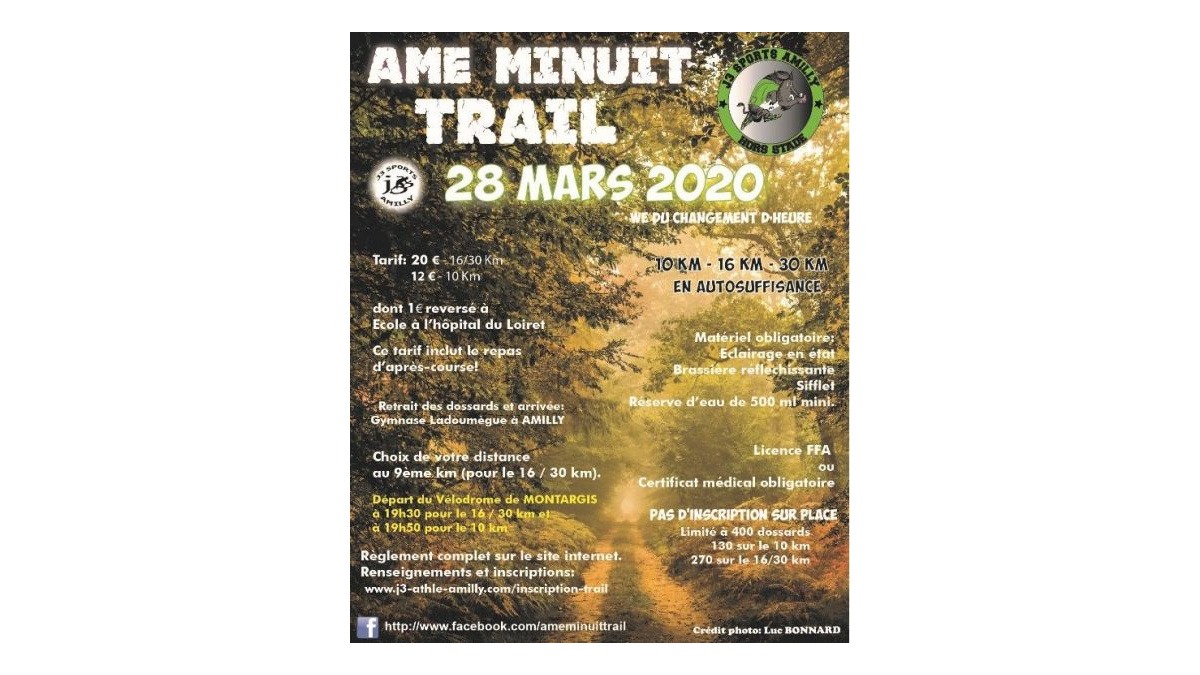 AME MINUI TRAIL est une course de nuit autonome de 30 et 15 km, organisée par la zone d’athlétisme J3 Sports Amilly. Le départ est à 19h30.