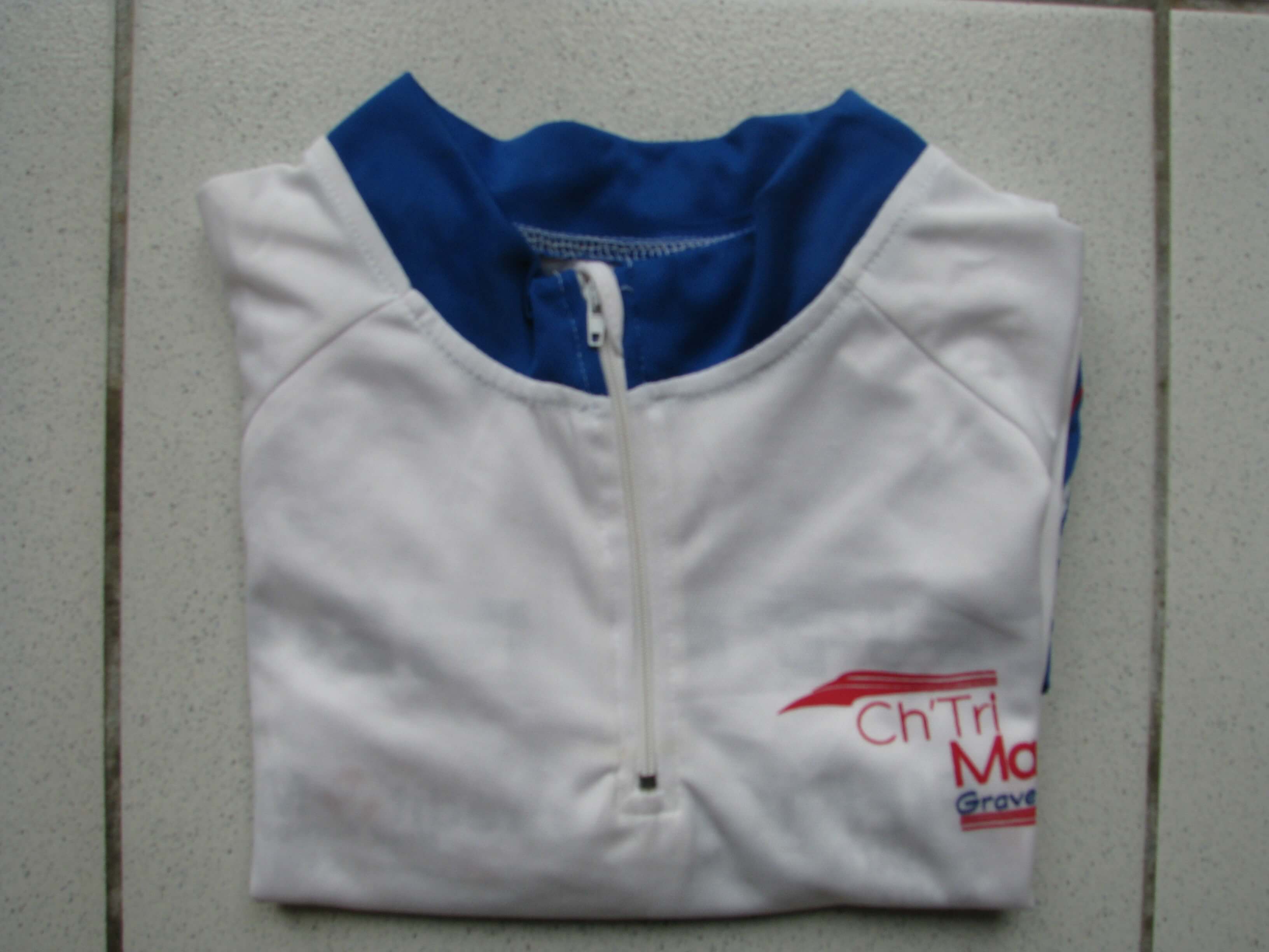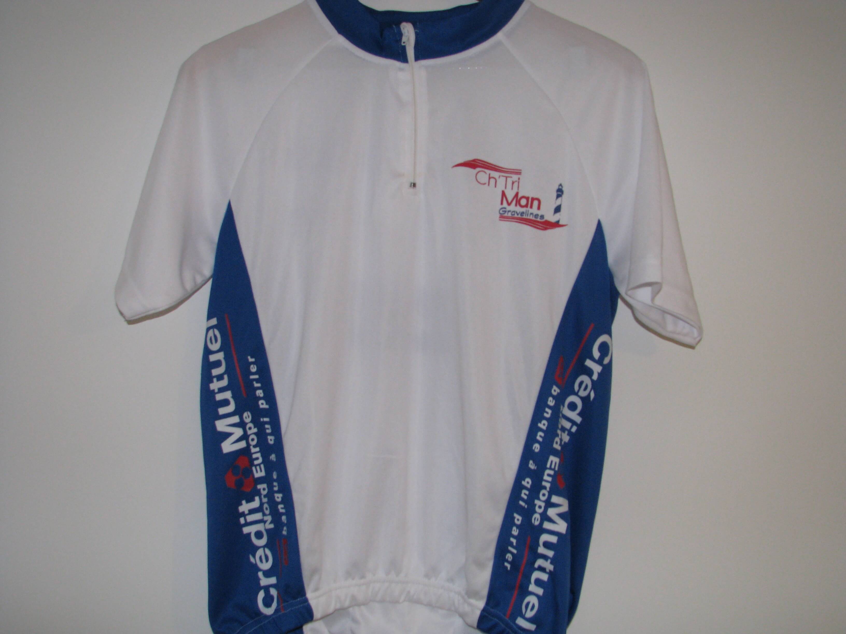 Bonjour, je vends un maillot de vélo aux couleurs du CH’TRIMAN à GRAVELINES (Triathlon 2013), pour HOMME, de couleur blanc et bleu, en taille M. Le maillot est 100% neuf : il n’a jamais servi. Inscription face avant : Ch’Tri Man Gravelines Inscriptions latérales : Crédit Mutuel Nord Europe Inscriptions dos arrière : CHTRIMAN, Eiffage Travaux Publics Nord, Crédit Mutuel Nord Europe, Isostar Trois poches dans le dos. Idéal pour garder un souvenir de la course ou tout simplement porter un textile technique et sportif.