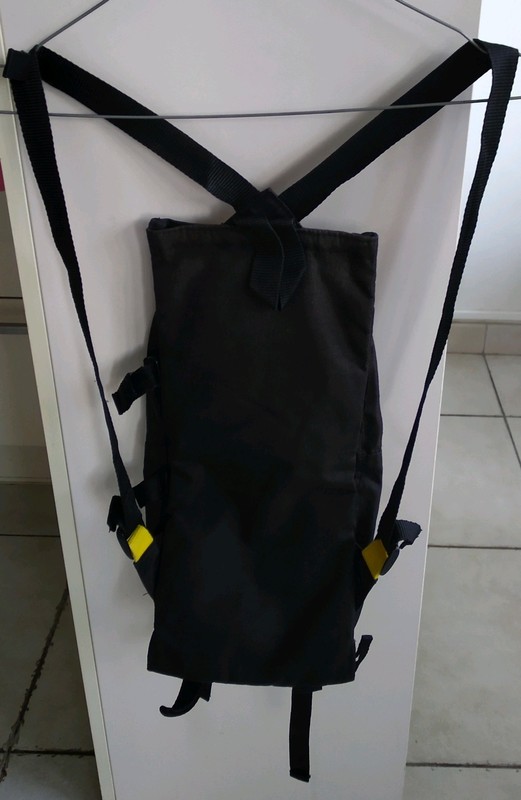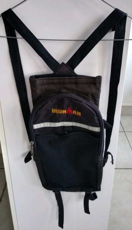 Sac à dos Ironman triathlon ingear. De couleur noir, donc discret. Pesant 235 gr donc léger et très compact. Parfait pour transporter par exemple bouteille d'eau, en-cas, les essentiels lors d'un footing, d'une balade en campagne ou en ville. Possède 1 poche extérieure. 2 compartiments distincts et fermés, l'un à zip et l'autre à scratch, 2 crochets. Le compartiment à zip contient lui-même 1 petite poche à scratch et 1 à zip. Porté quelques fois. De très bonne qualité. Récupérer à Neuilly sur Seine, Levallois Perret, Paris 17, Paris 16. Prix de vente hors frais d'envoi, qui sont de 5€.