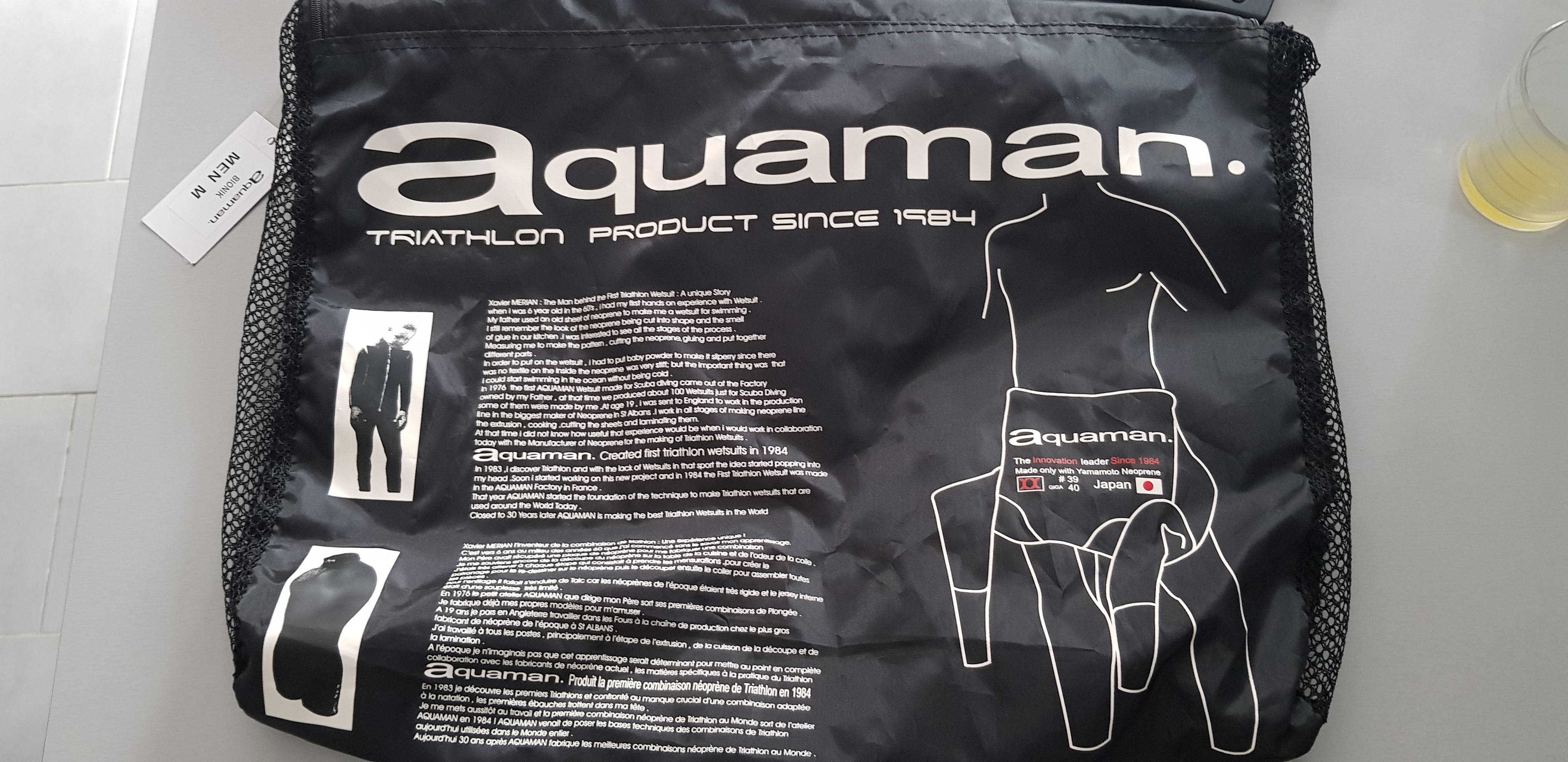 Salut je vends ma combinaison de triathlon en taille M. Elle est neuve. Son prix: 525 euros. Flottaison parfaite. Mon Prix: 430 euros. La "petite soeur de la GOLD". La combinaison Aquaman Bionik est sans aucun doute le meilleur Rapport qualité prix du marché. Une combinaison haut de gamme à un prix très attractif. De conception classique c'est-à-dire avec le maillot à l'intérieur. La Bionik est entièrement fabriquée dans le Néoprène Japonais Yamamoto # 39 recouvert de SCS sur tout le Corps.