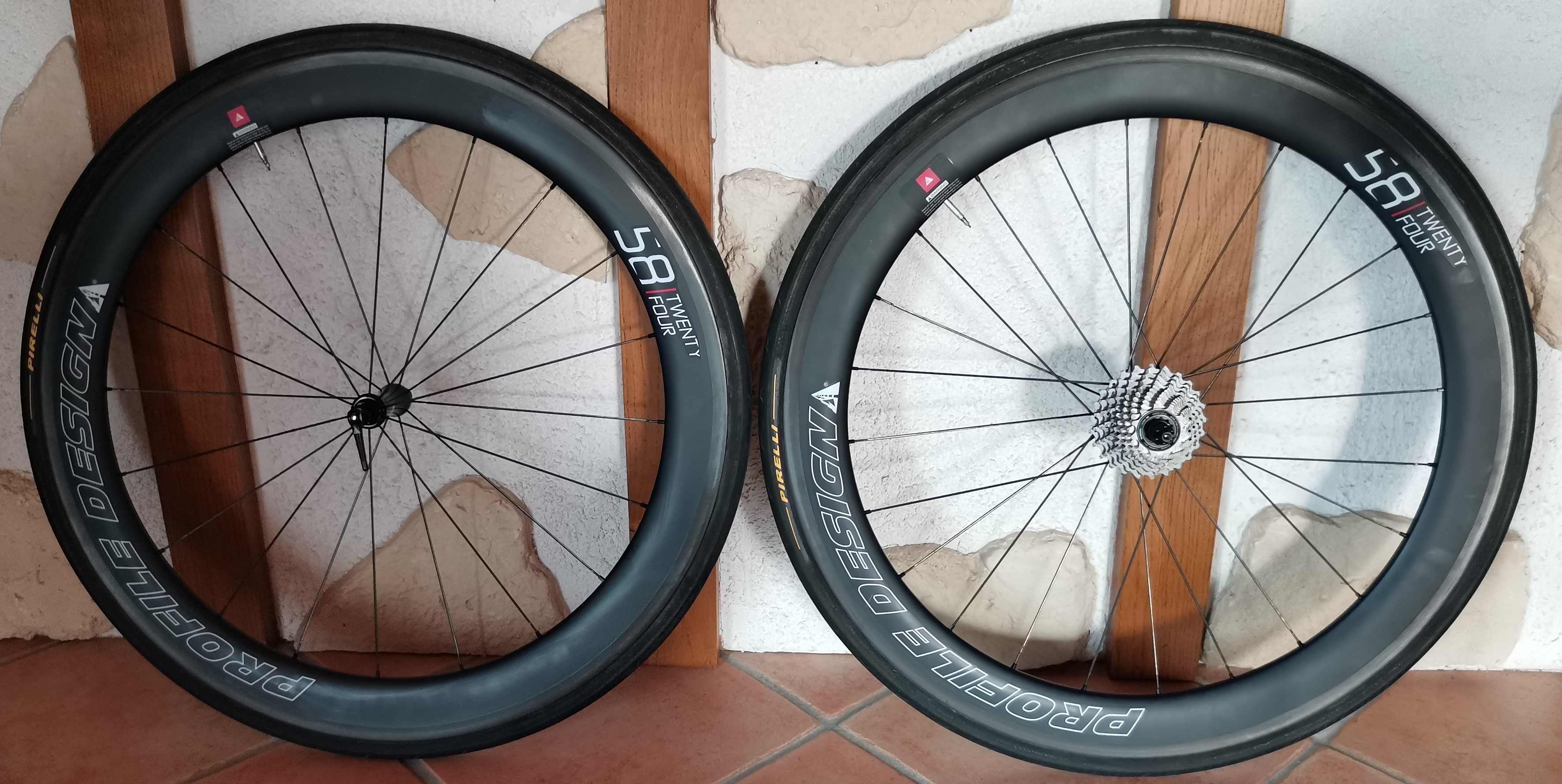 Paire de roues PROFILE DESIGN TWENTY FOUR 58mm à boyaux. Cassette 11V DURA-ACE 11-25. Montées avec boyaux PIRELLI P ZERO 25mm très peu roulés. Boyaux collés en août 2022 après nettoyage des jantes au chiffon sans solvant. Aucune marque ou choc sur flancs et pistes de freinage. Roulements parfaits. Pas de voile ni saut. Fournies avec blocages d'origine Profile Design. Envoi d'autres photos par mail possible. Paiement via PAYPAL, livraison Mondial Relay.