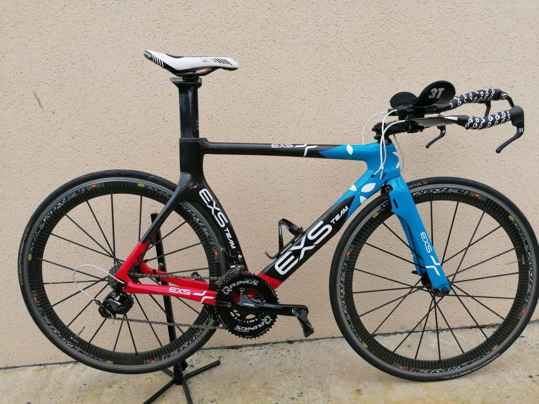 Vélo de CLM /Triathlon EXS. Taille M. Groupe shimano 105 11 vitesses. Manettes durace. Plateaux rotor q rings 52 /42. Freinage TRP intégrés. Roues mavic cosmic carbone SLR (rayons carbone). Selle prollogo. Cintre 3T carbone. Achat possible sans les roues PAS D'EXPEDITION