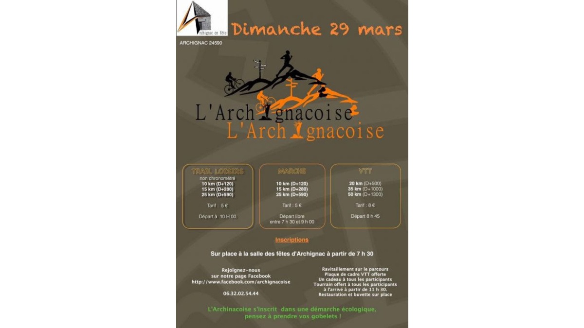 Archignacoise est organisé par Archignac en Fête. Cet événement est inclus dans le calendrier Dordogne Hors Stade. Il s’agit d’une course naturaliste qui se déroule dans les communes d’Artignac et Saint-Amand-de-Coly entre Montignac et Sarlat, à quelques kilomètres de Correza (25 minutes de Brive).